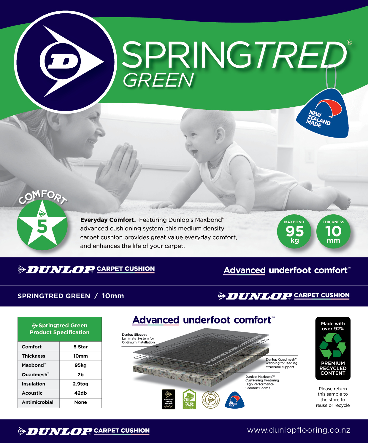 Everyday Comfort. Featuring Dunlop’s MaxbondTM advanced cushioning system, this medium density carpet cushion provides great value everyday comfort, and enhances the life of your carpet.